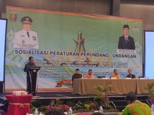 Ketua DPRD Provinsi Lampung, Mingrum Gumay, SH., MH. memberikan sambutan sekaligus membuka acara kegiatan Sosialisasi Peraturan Perundang-undangan yang diadakan