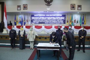 Gubernur Lampung Arinal Djunaidi dan Ketua DPRD Provinsi Lampung Mingrum Gumay bersama 4 Wakil Ketua DPRD menandatangani Rancangan Peraturan